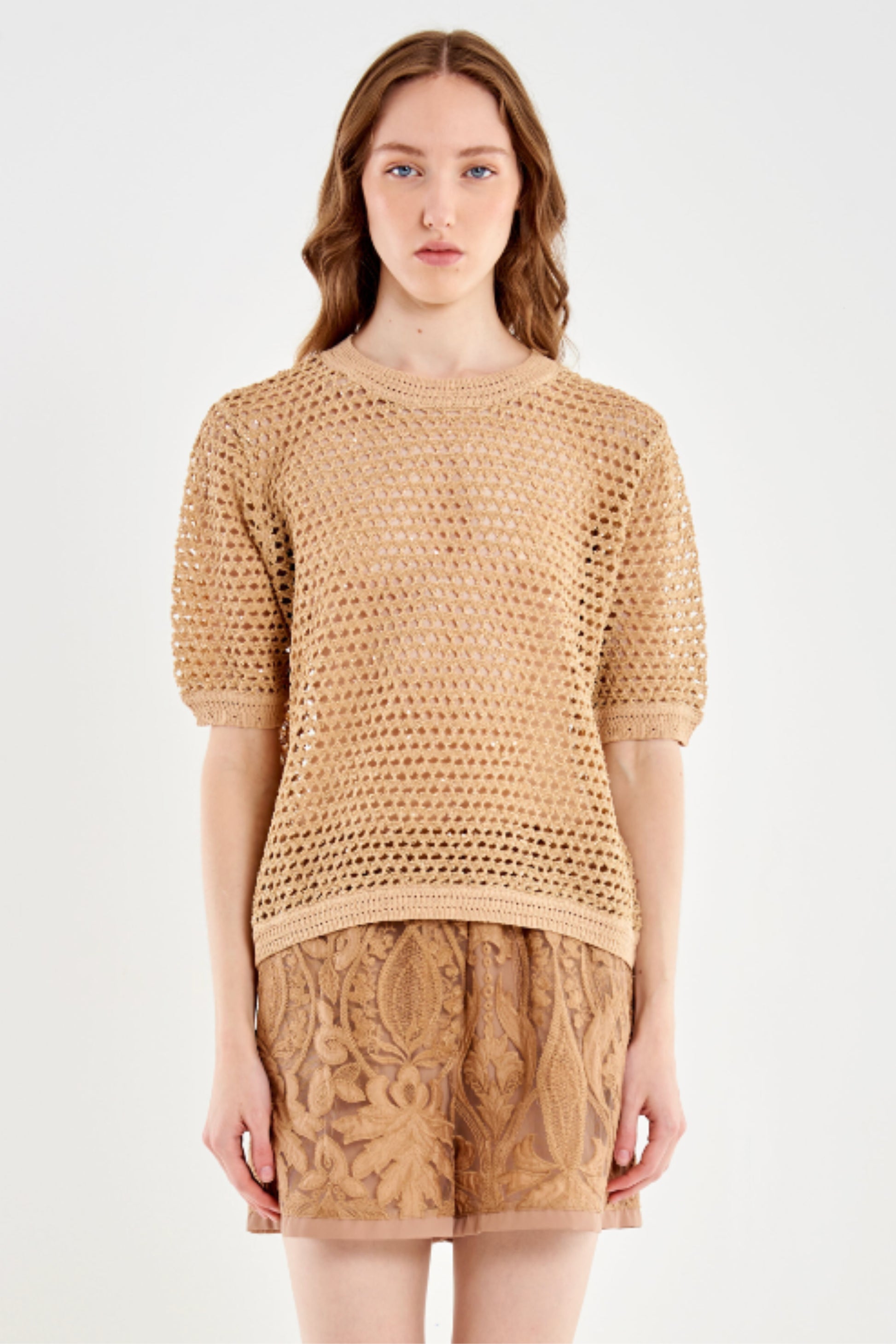 Dieses kurzärmelige Stricktop überzeugt durch seine offen gearbeitete Struktur und einen klaren, geraden Schnitt. Der klassische Rundhalsausschnitt und die leicht überschnittenen Schultern sorgen für eine moderne, entspannte Silhouette. Die grob strukturierte Strickoptik verleiht dem Design eine besondere Leichtigkeit und macht das Top zu einem vielseitigen Layering-Piece. Fein gerippte Abschlüsse an Ausschnitt, Ärmeln und Saum runden das Modell harmonisch ab.