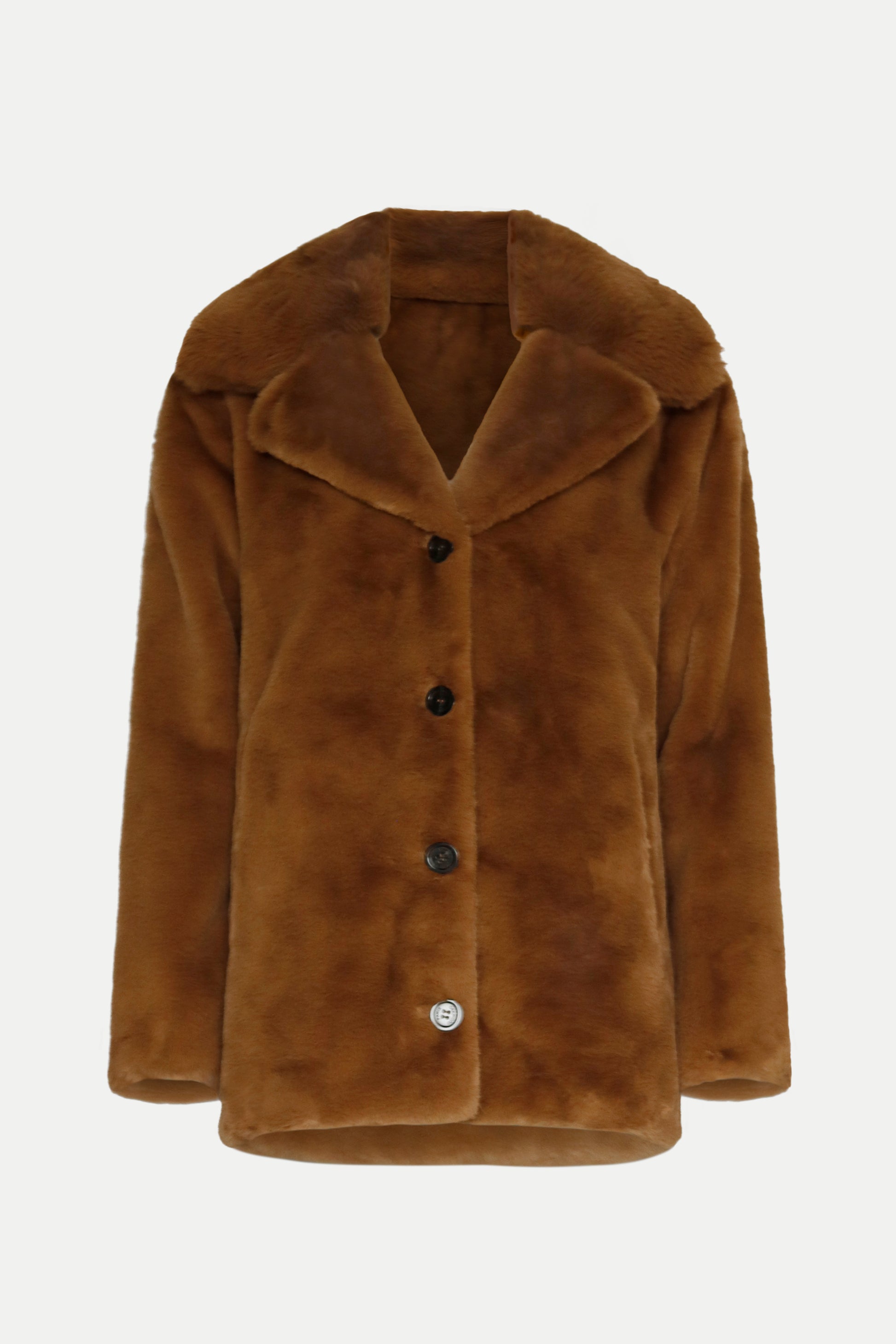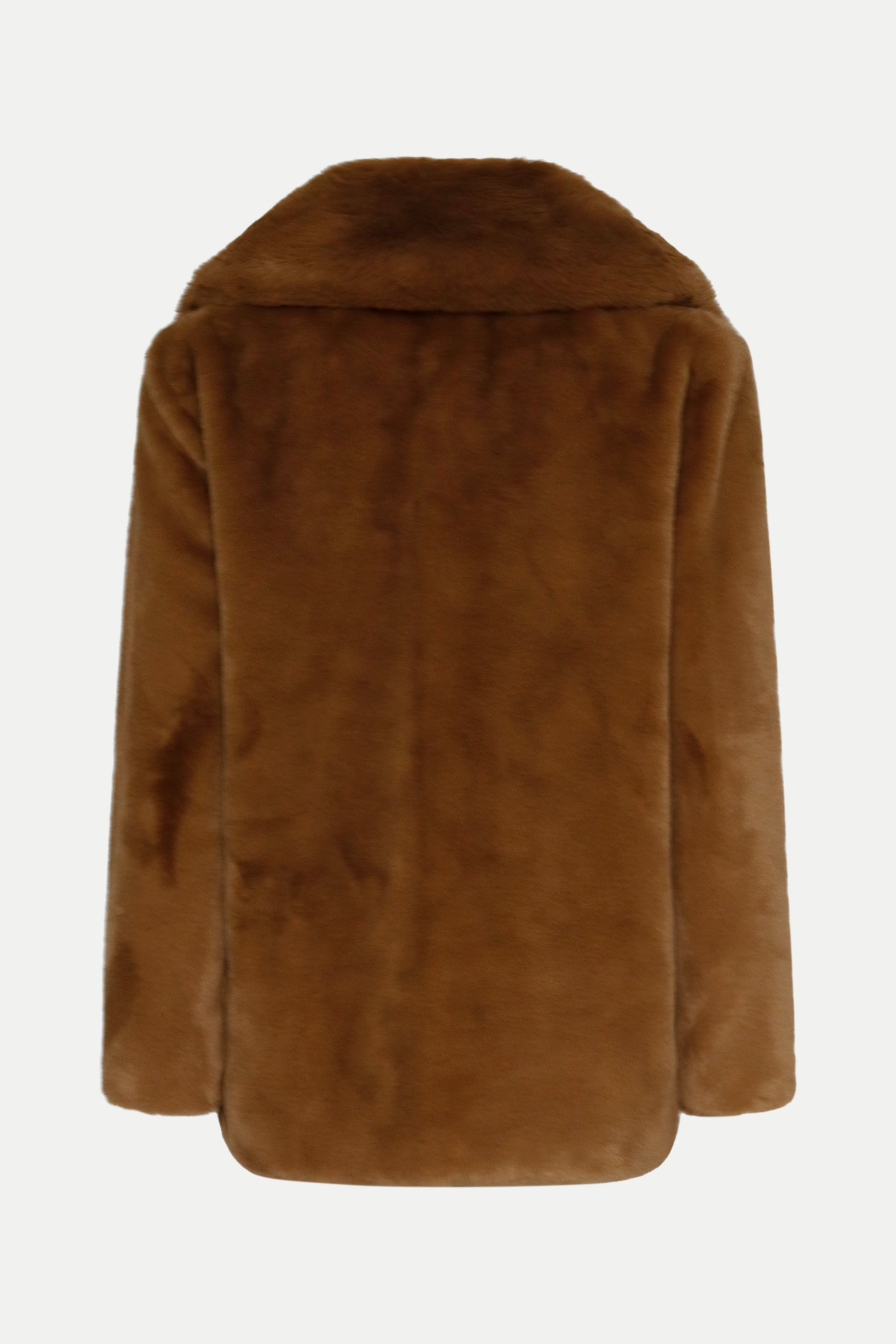 Dieser luxuriöse Mantel aus hochwertigem Kunstpelz verbindet stilvolle Eleganz mit wohliger Wärme. Die weiche Fell-Optik in sattem Braun verleiht jedem Outfit einen Hauch von Glamour, während der klassische Reverskragen und die gerade Passform für zeitlose Raffinesse sorgen. Dank seiner kuscheligen Haptik bietet er höchsten Tragekomfort und ist die perfekte Wahl für kalte Tage.