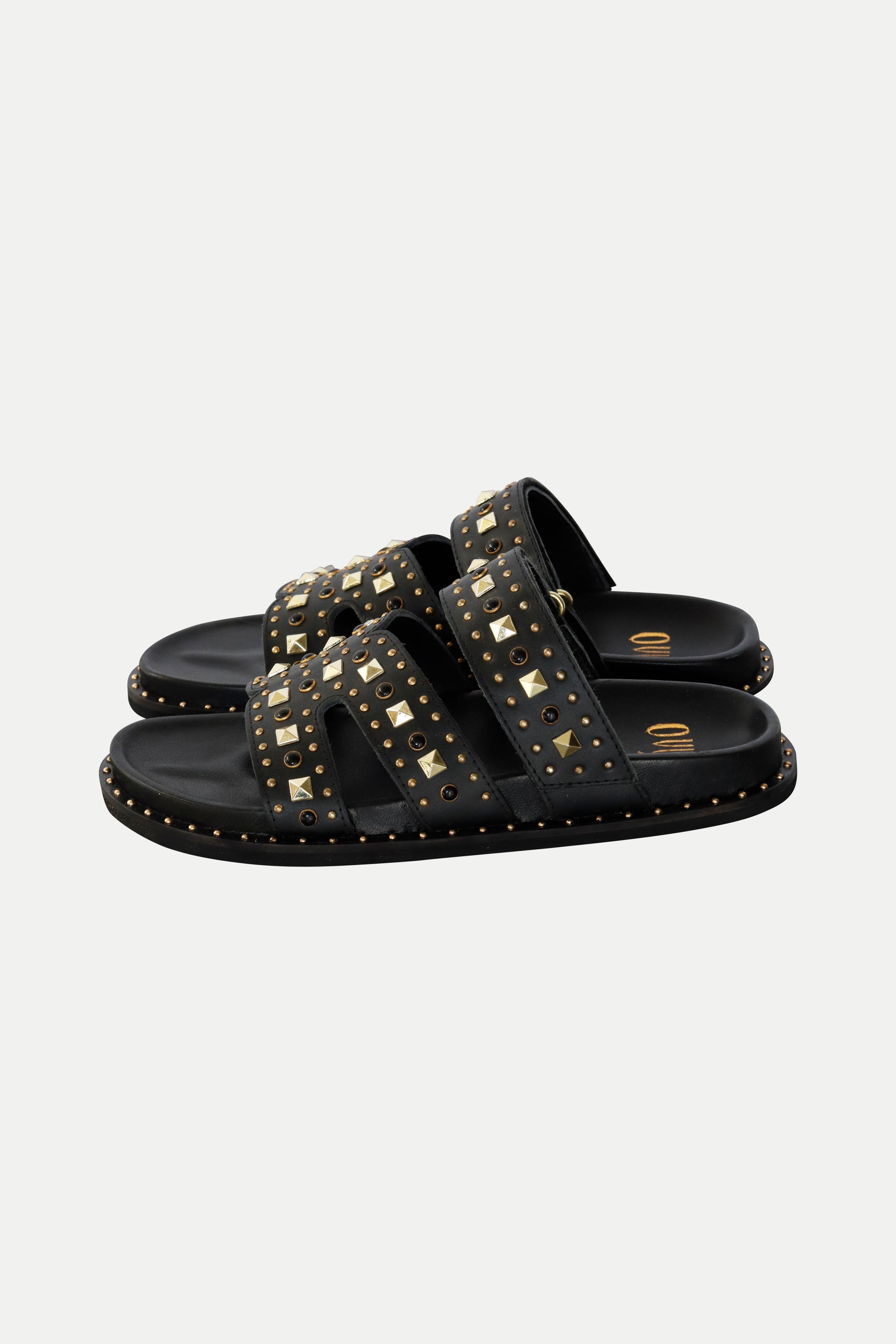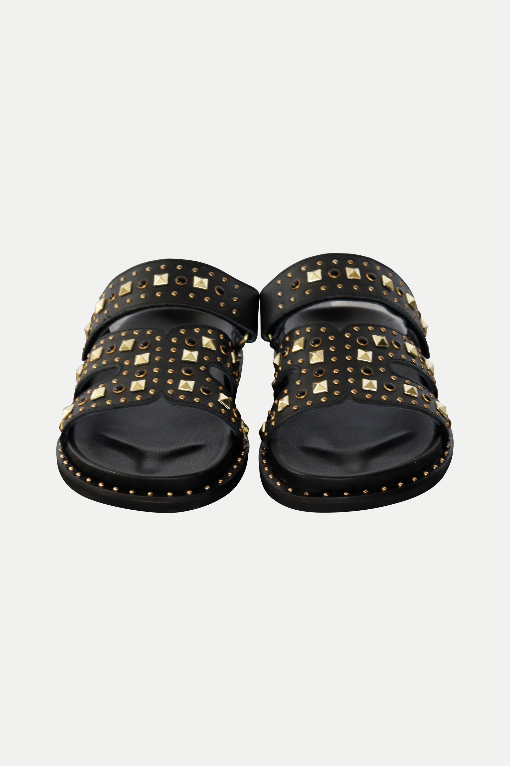 Diese schwarzen Riemensandalen mit goldfarbenen Nieten sind ein kraftvolles Statement für warme Tage. Das glänzende Kunstleder sorgt für eine edle Anmutung, während die dreifache Riemenführung Stabilität und Stil vereint. Die Kombination aus kantigen und runden Nieten verleiht dem Design eine spannende Dynamik und einen Hauch Rock-Glam.