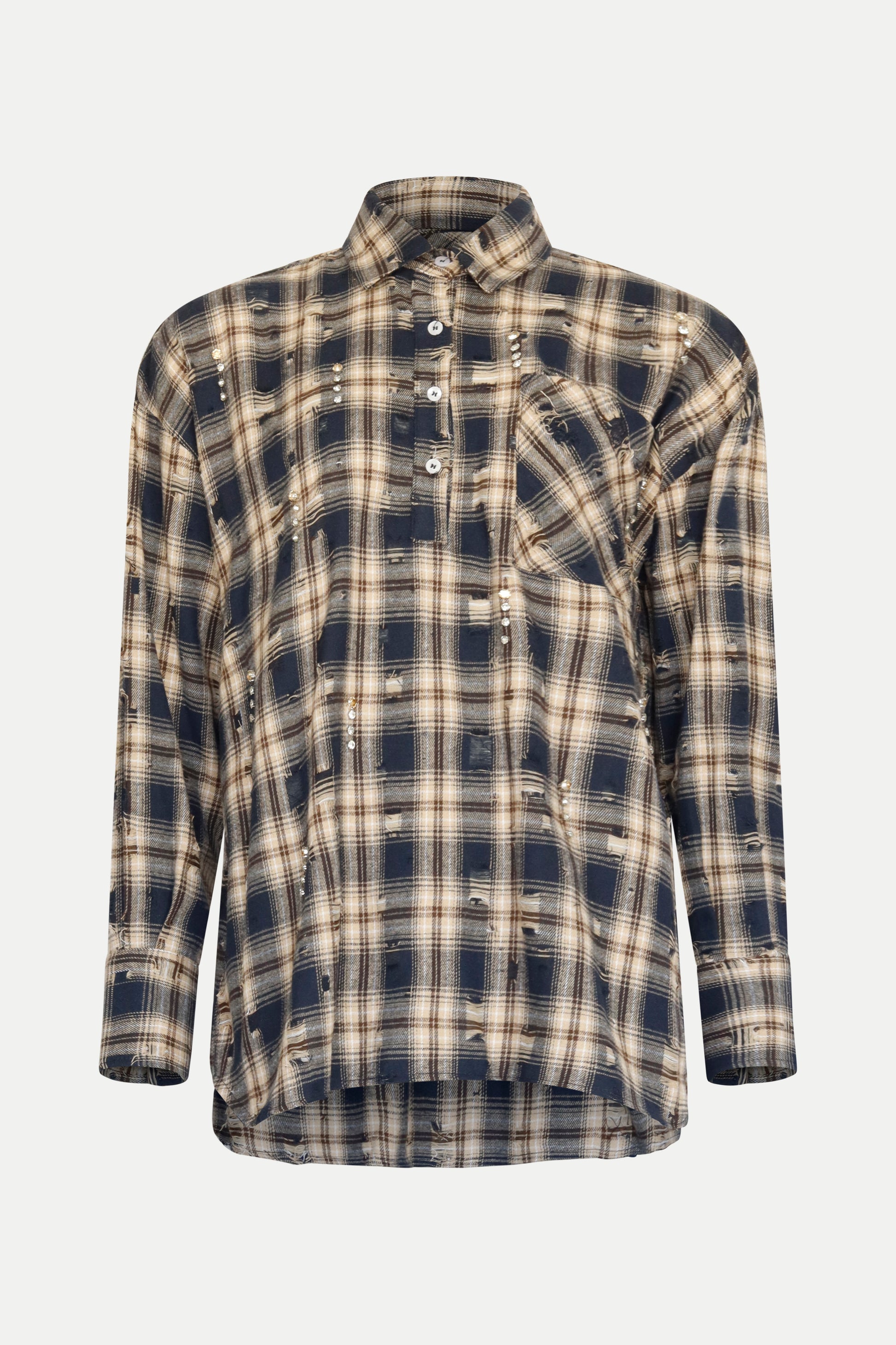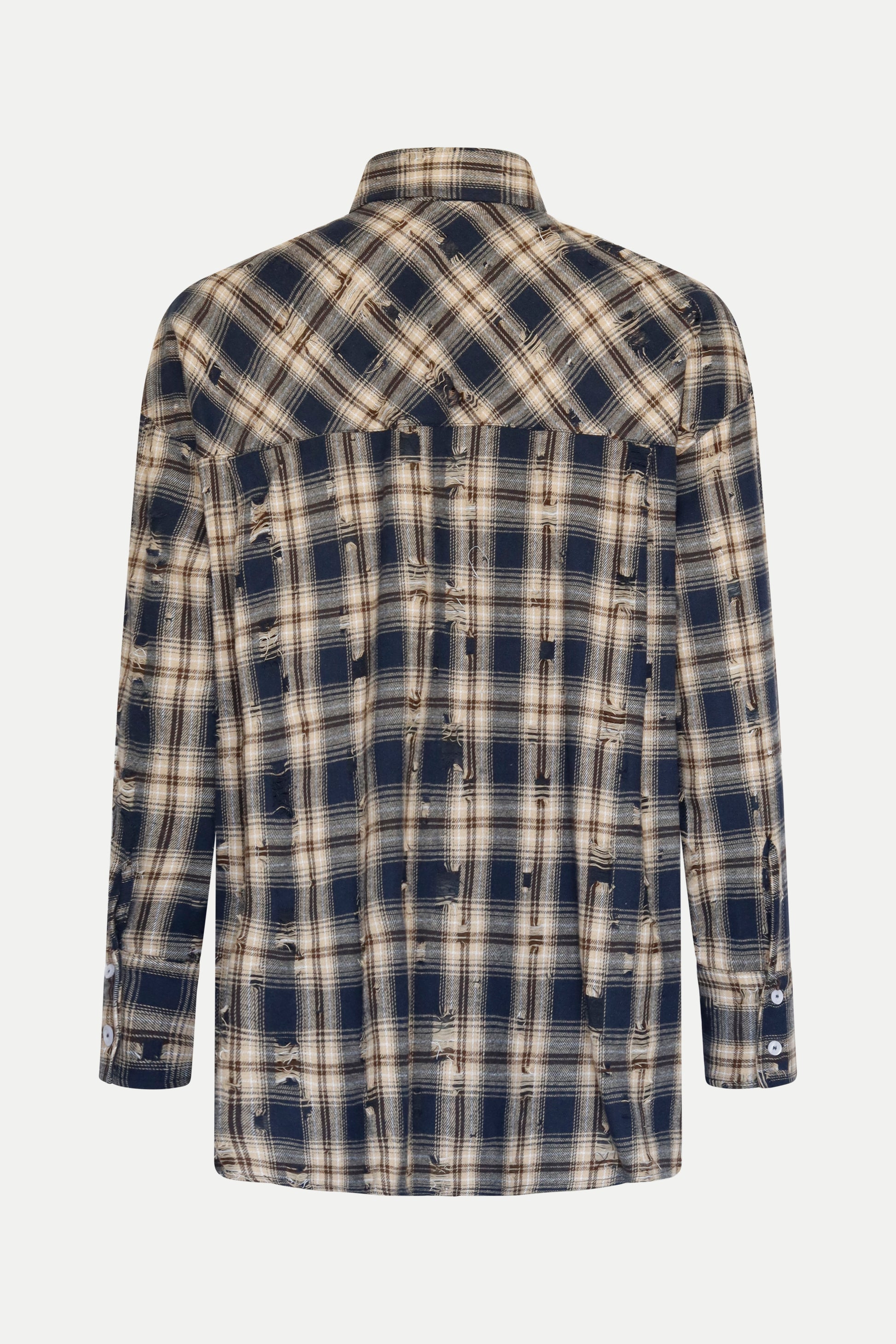 Lässiges Karohemd in Blau-Beige mit modernem Used-Look. Kleine Distressed-Details verleihen dem klassischen Muster einen coolen Twist und machen das Hemd zu einem echten Statement-Piece. Ob offen über T-Shirt getragen oder solo gestylt – es passt perfekt zu Jeans und Sneakern für einen entspannten Streetstyle.