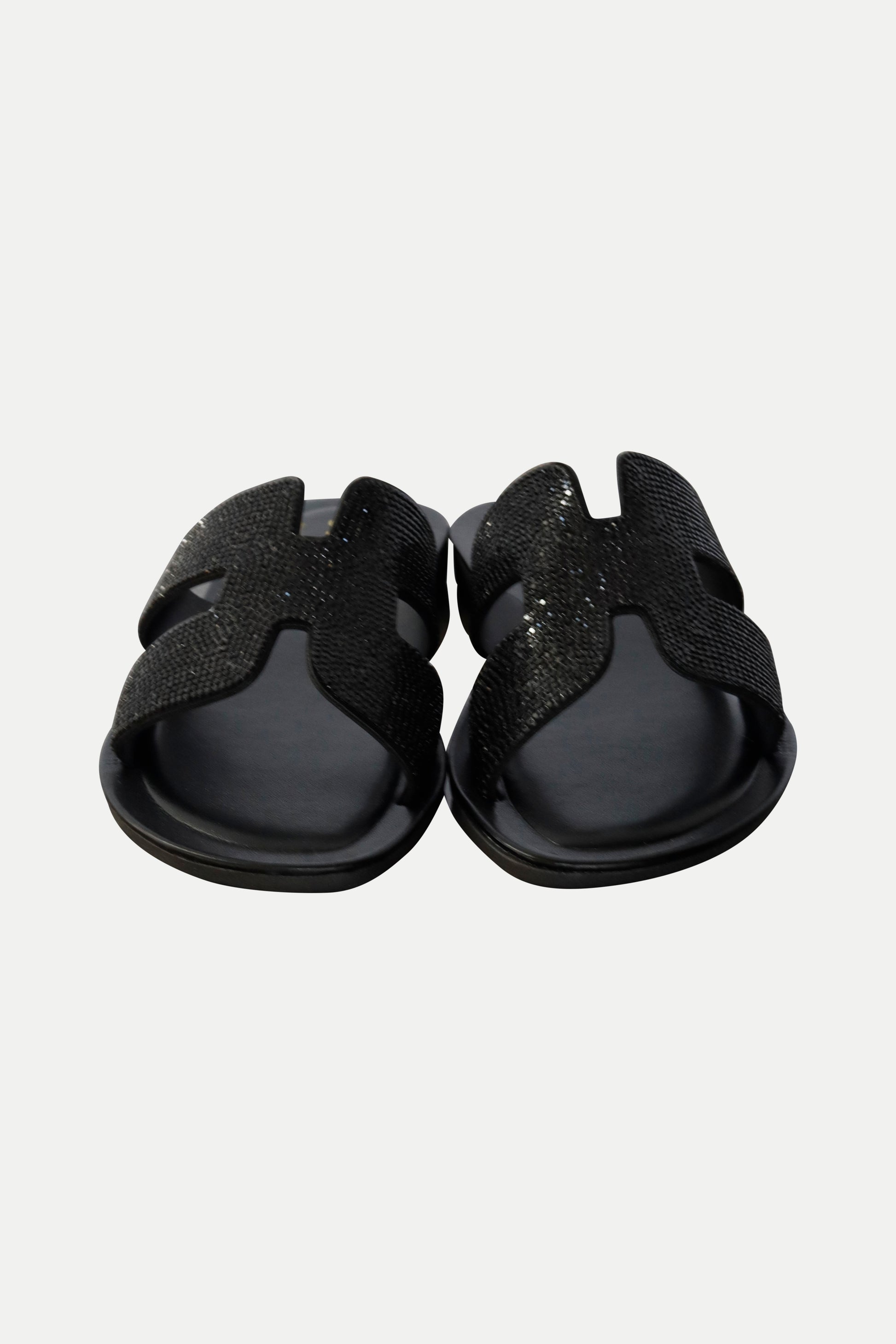 Verleihen Sie Ihrem Outfit das gewisse Etwas mit diesen edlen schwarzen Sandalen. Das markante Design mit breiten, überkreuzten Riemen und funkelndem Glitzereffekt setzt modische Akzente und sorgt für einen stilvollen Auftritt – ob im Alltag, im Urlaub oder bei sommerlichen Events. Die flache Sohle und das offene Design bieten höchsten Tragekomfort und machen die Sandalen zum idealen Begleiter für warme Tage.