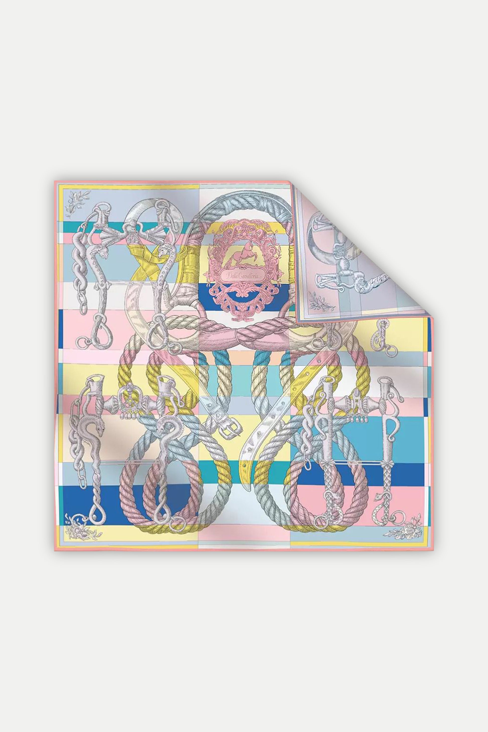 Das zarte Design zeigt kunstvoll verschlungene Seile, maritime Knoten und feine metallische Details, die sich über ein pastellfarbenes Karomuster aus Rosé, Himmelblau, Gelb und Elfenbein legen. Die Komposition erinnert an elegante Hafenszenen an der Côte d’Azur – wo Sonne, Wind und Meer in perfekter Harmonie aufeinandertreffen.