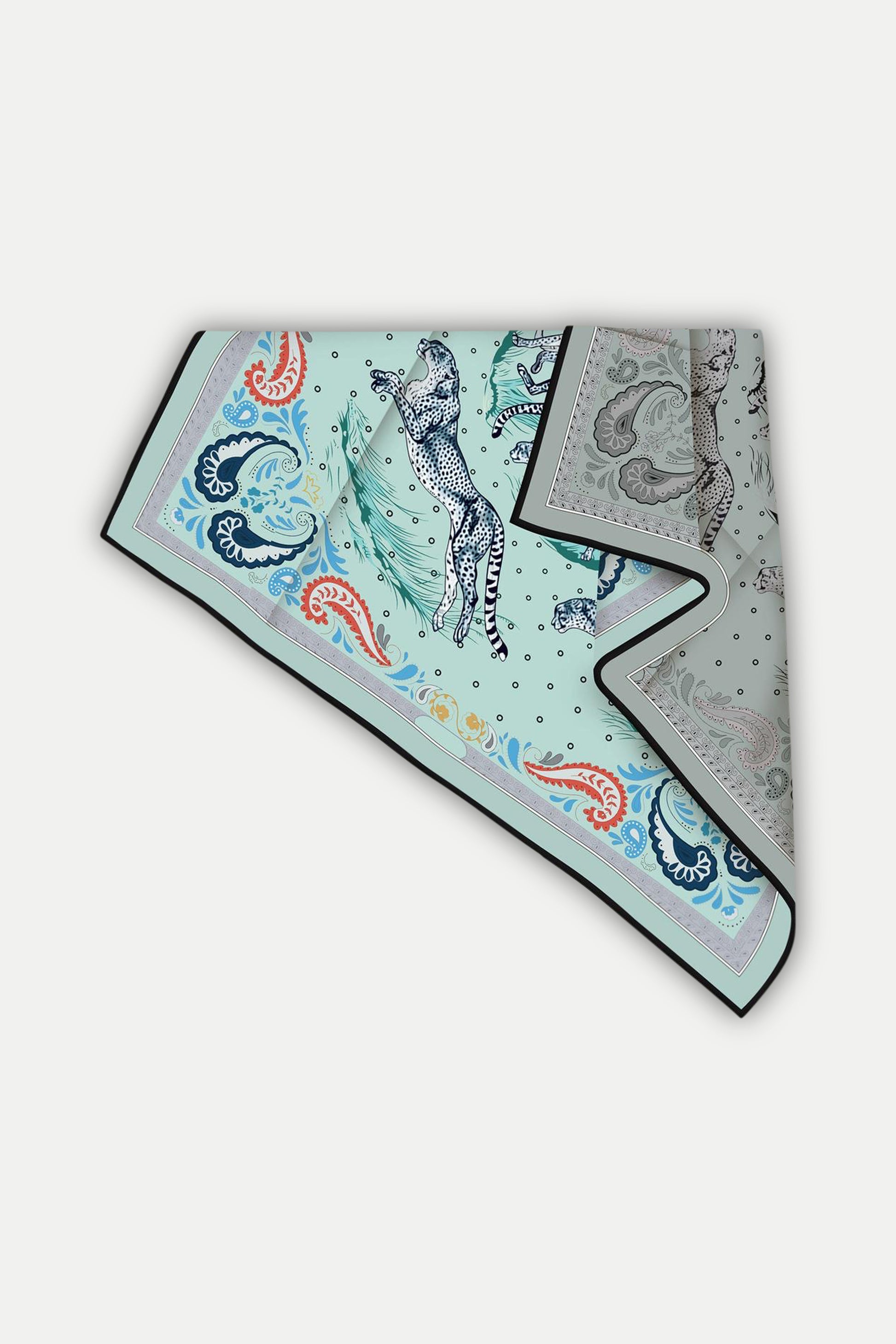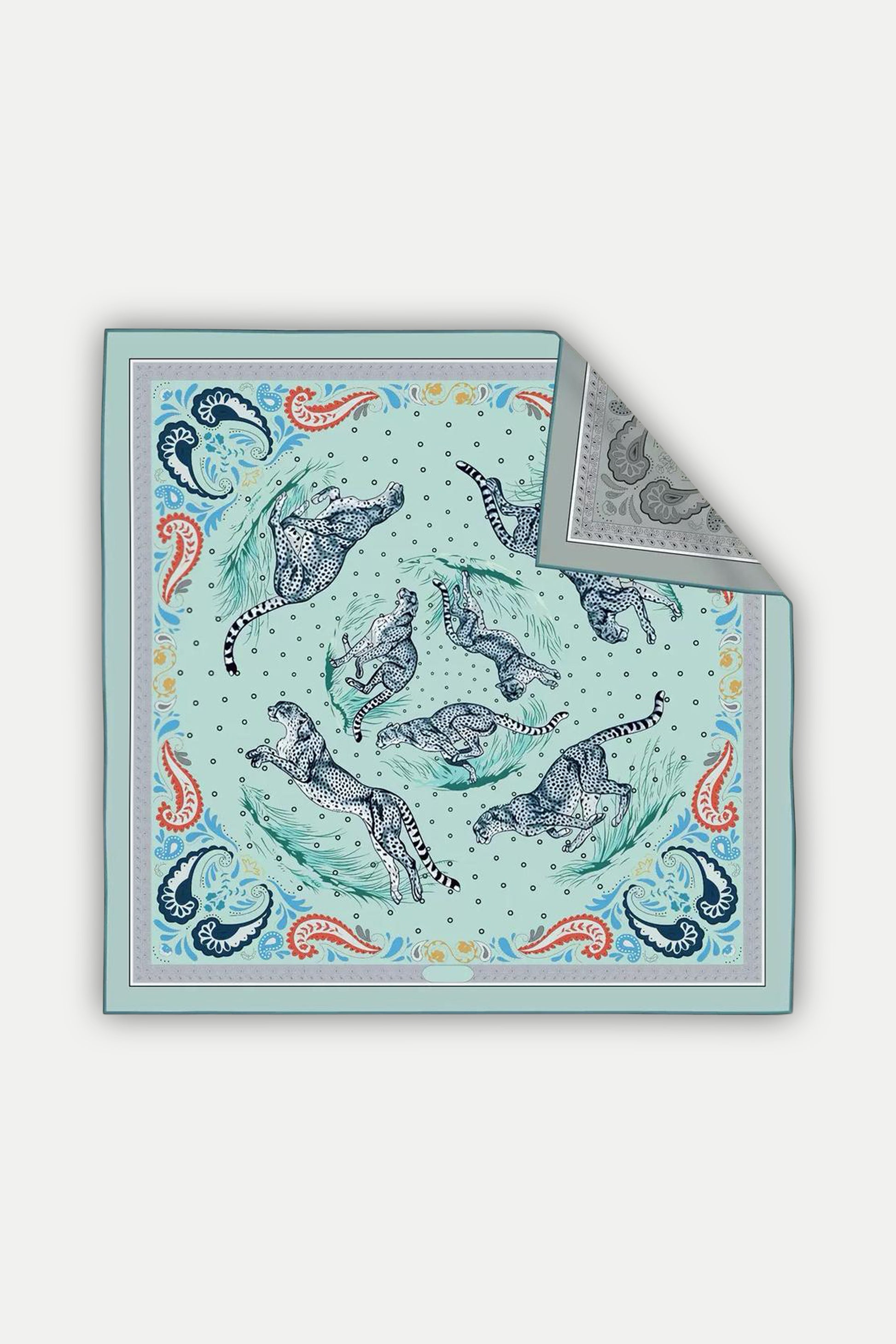 Das eindrucksvolle Design zeigt anmutige Leoparden im Lauf, eingefangen in Momenten grenzenloser Energie und Leichtigkeit. Feinste Linien und fließende Formen verleihen der Komposition Rhythmus und Spannung, während das zarte Paisley-Motiv an den Rändern einen Hauch klassischer Eleganz hinzufügt.