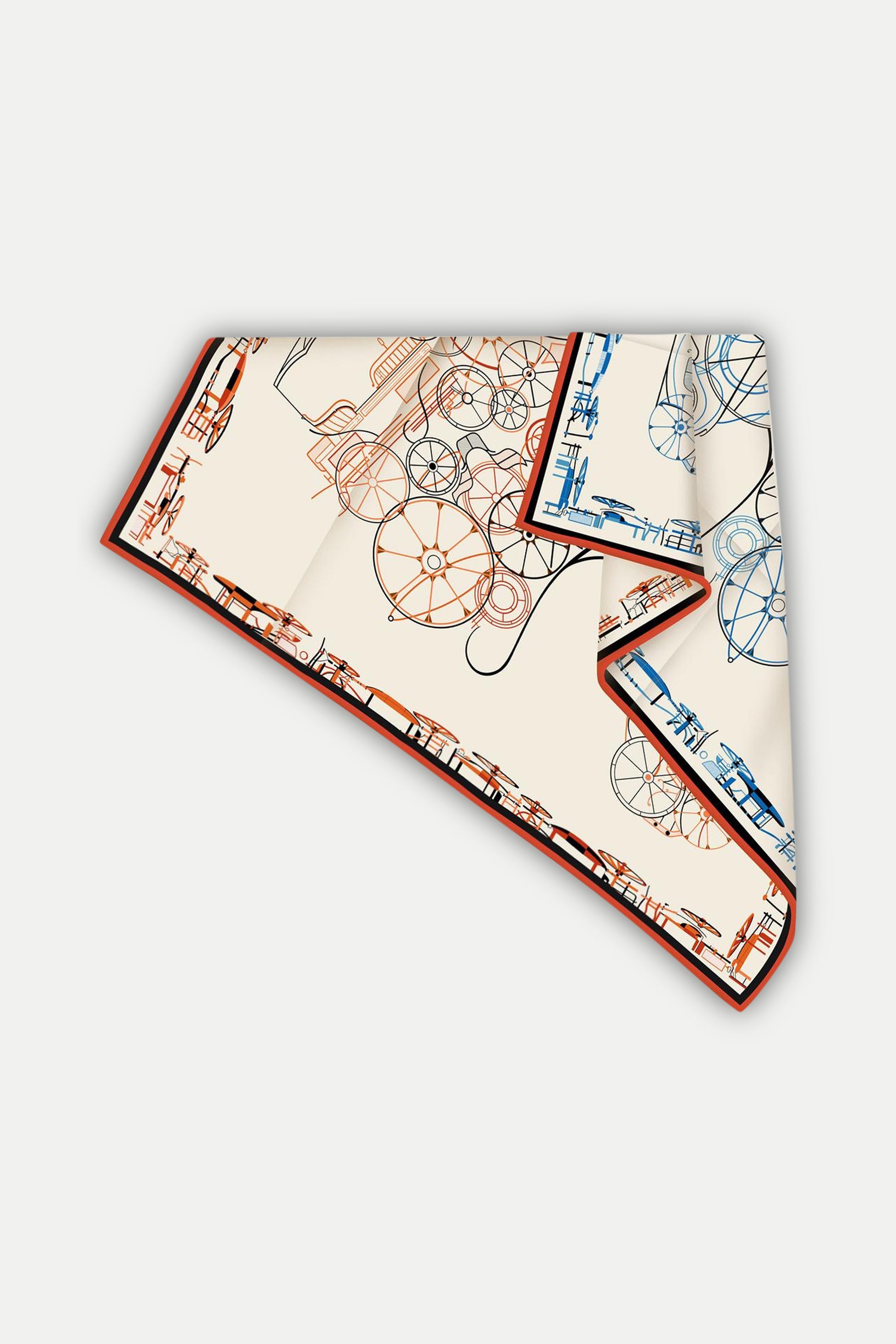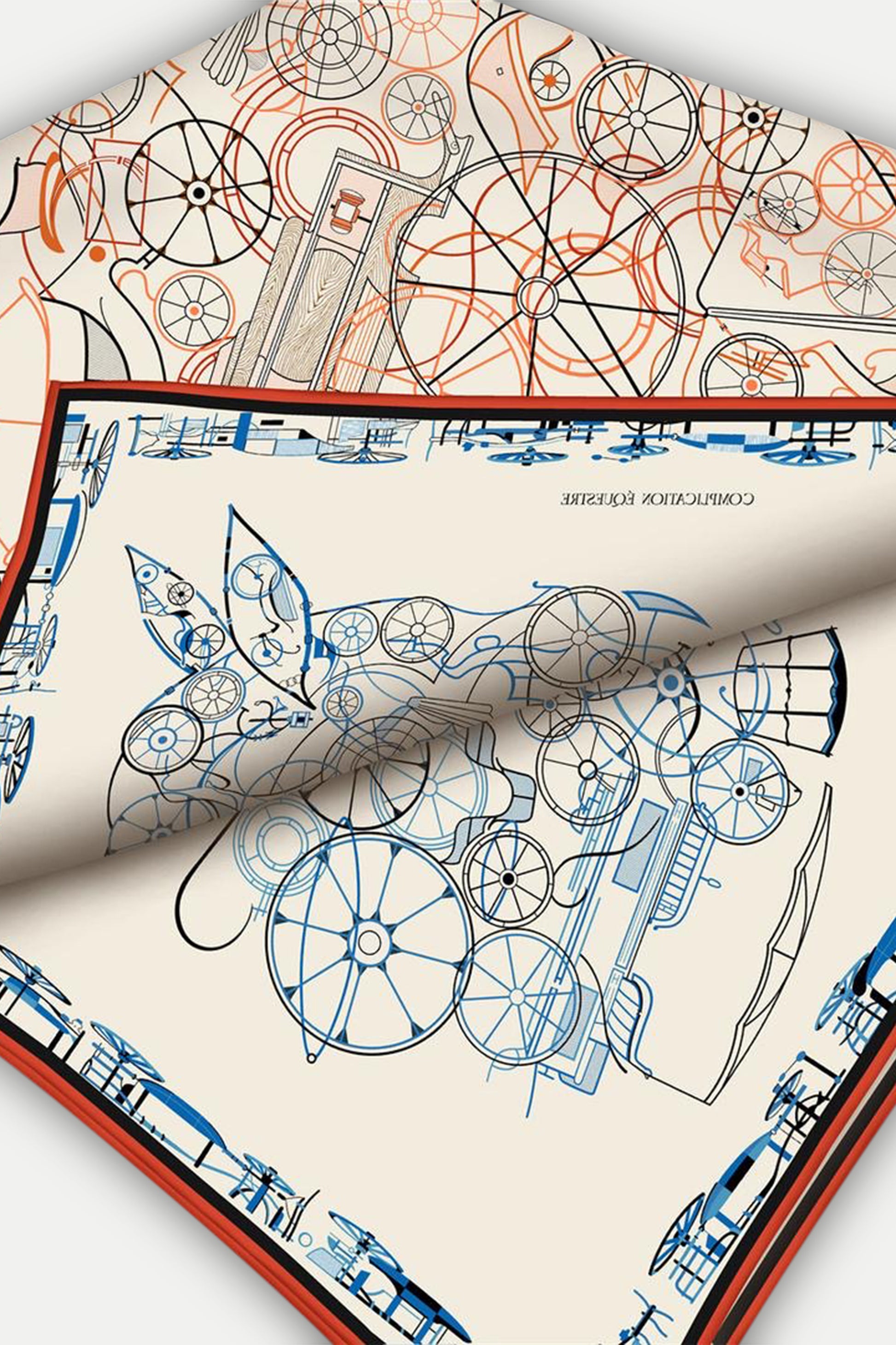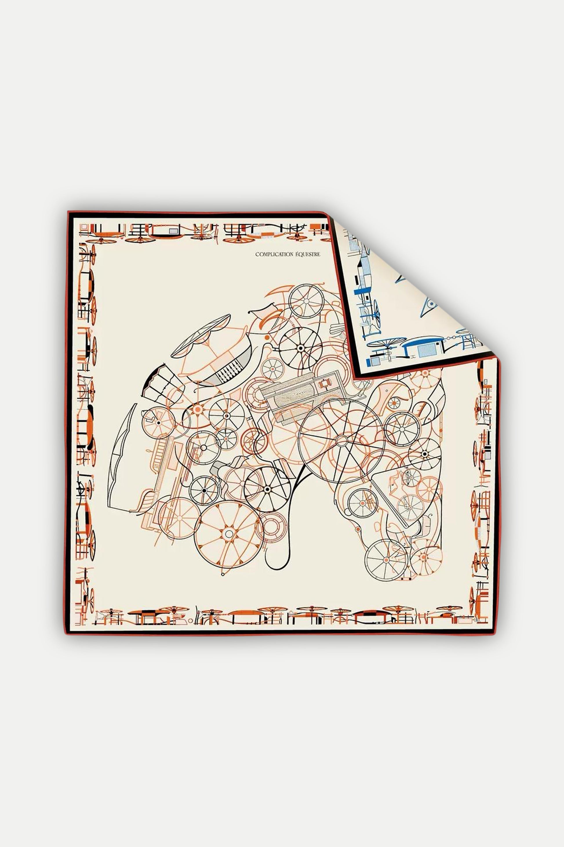 Feinste Linien, präzise Komposition und meisterhafte Balance – das Seidentuch „Complication Équestre“ ist eine Hommage an die Kunst der Bewegung und die Faszination technischer Perfektion.