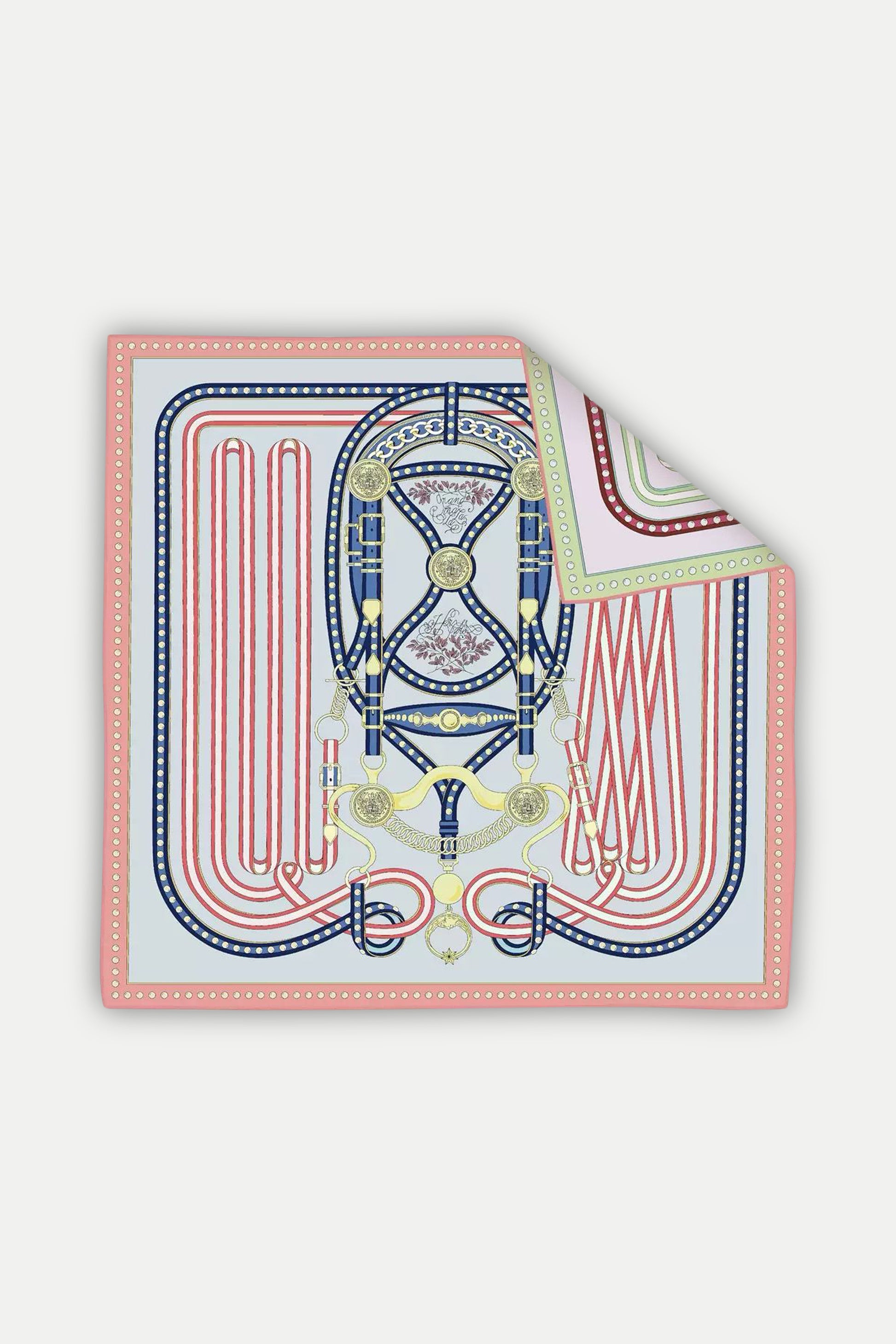 Das kunstvoll komponierte Design zeigt fein verschlungene Riemen, glänzende Metallelemente und symmetrische Linien, die sich zu einer harmonischen, fast architektonischen Komposition verweben. Inspiriert von der Ausstrahlung königlicher Reitausrüstung und der französischen Savoir-faire-Tradition, strahlt dieses Tuch pure Raffinesse und Balance aus.