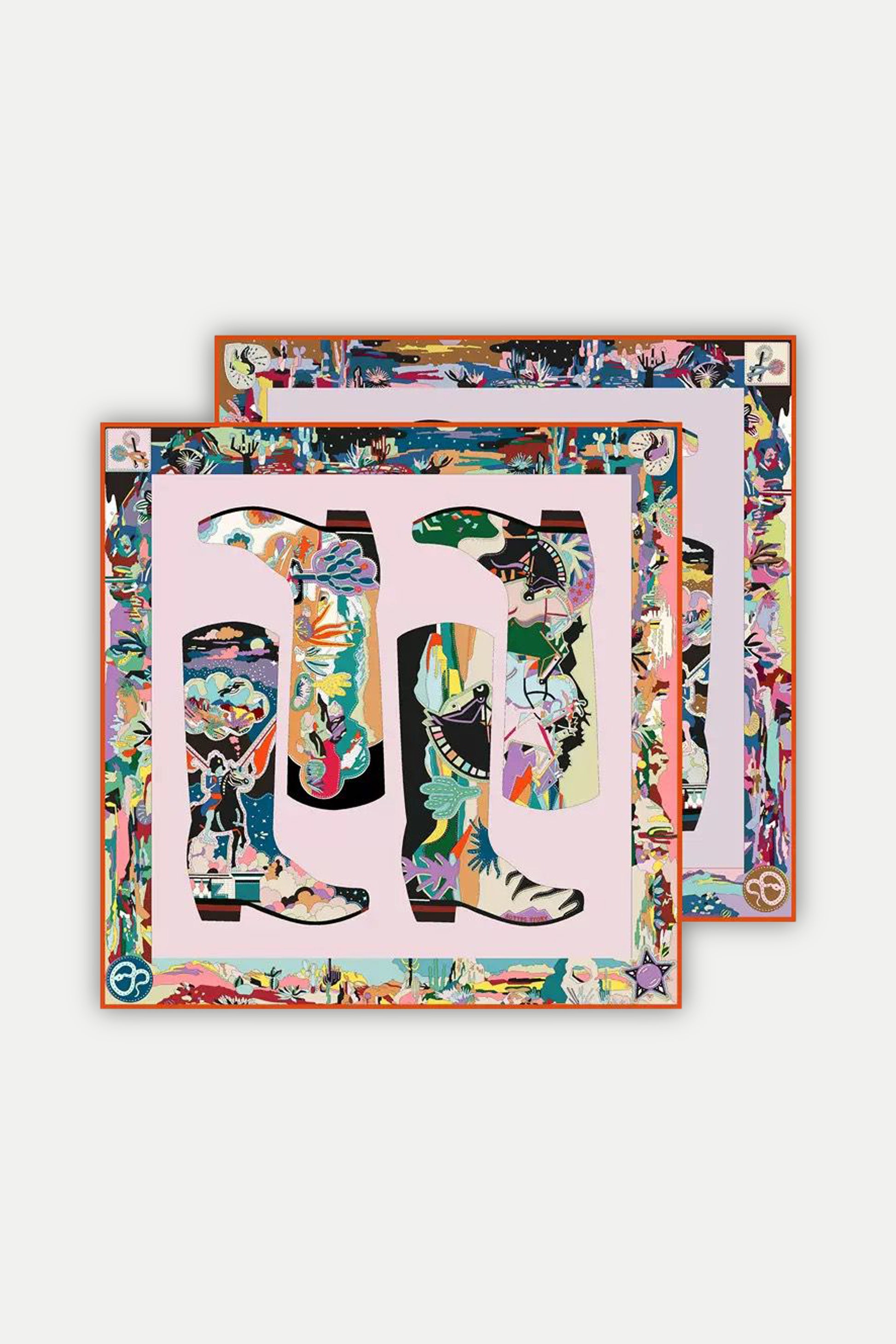 Das expressive Design zeigt farbenprächtige Reit- und Westernstiefel inmitten einer lebendigen Landschaft – eine Hommage an Abenteuerlust, Handwerkskunst und kreative Selbstentfaltung. Jeder Pinselstrich erzählt von Freiheit und Energie, eingefangen in feinster Seide.