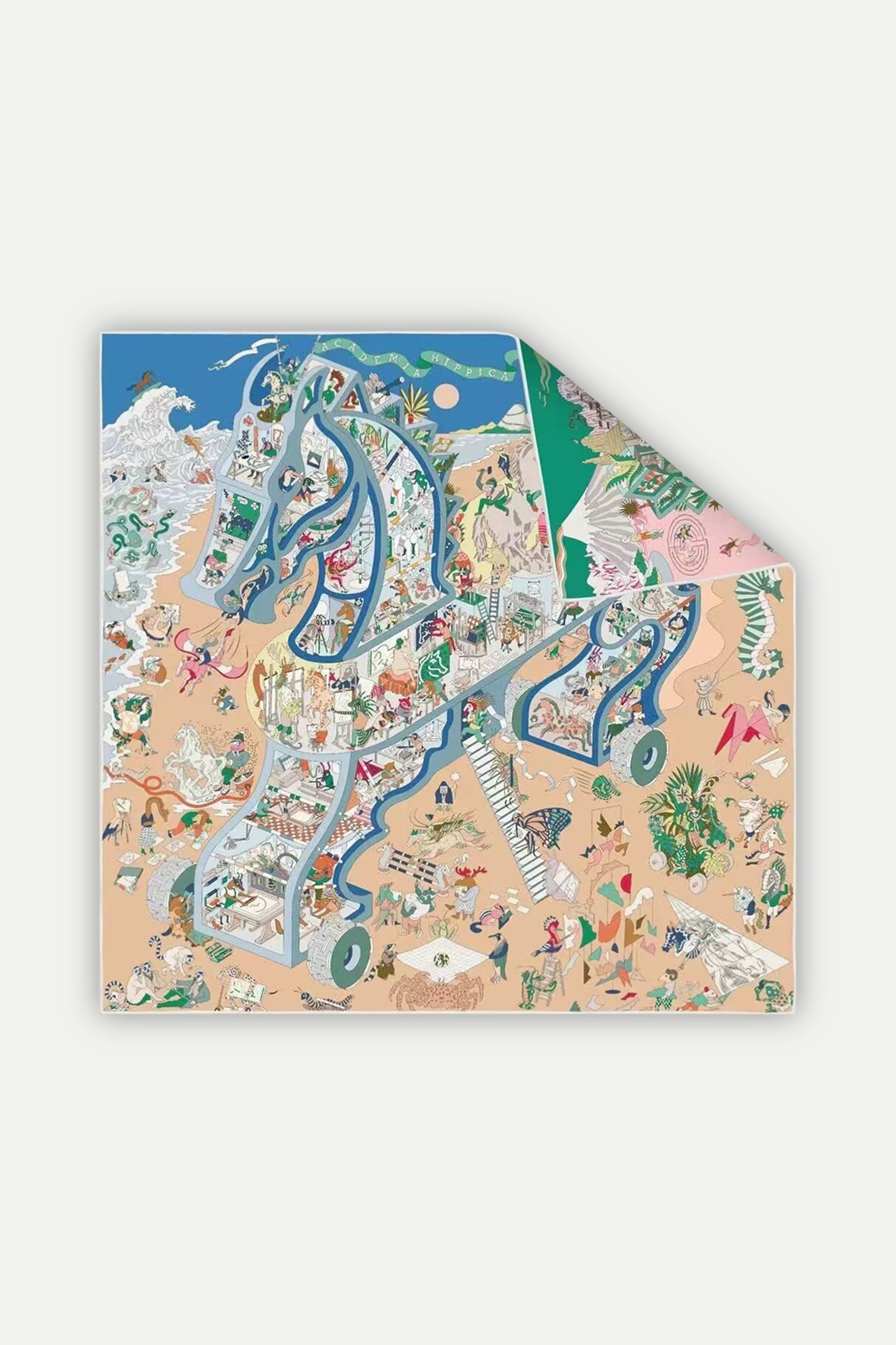 Mit seinen klassischen 90 × 90 cm lässt sich „L’Odyssée Équestre“ vielseitig tragen: