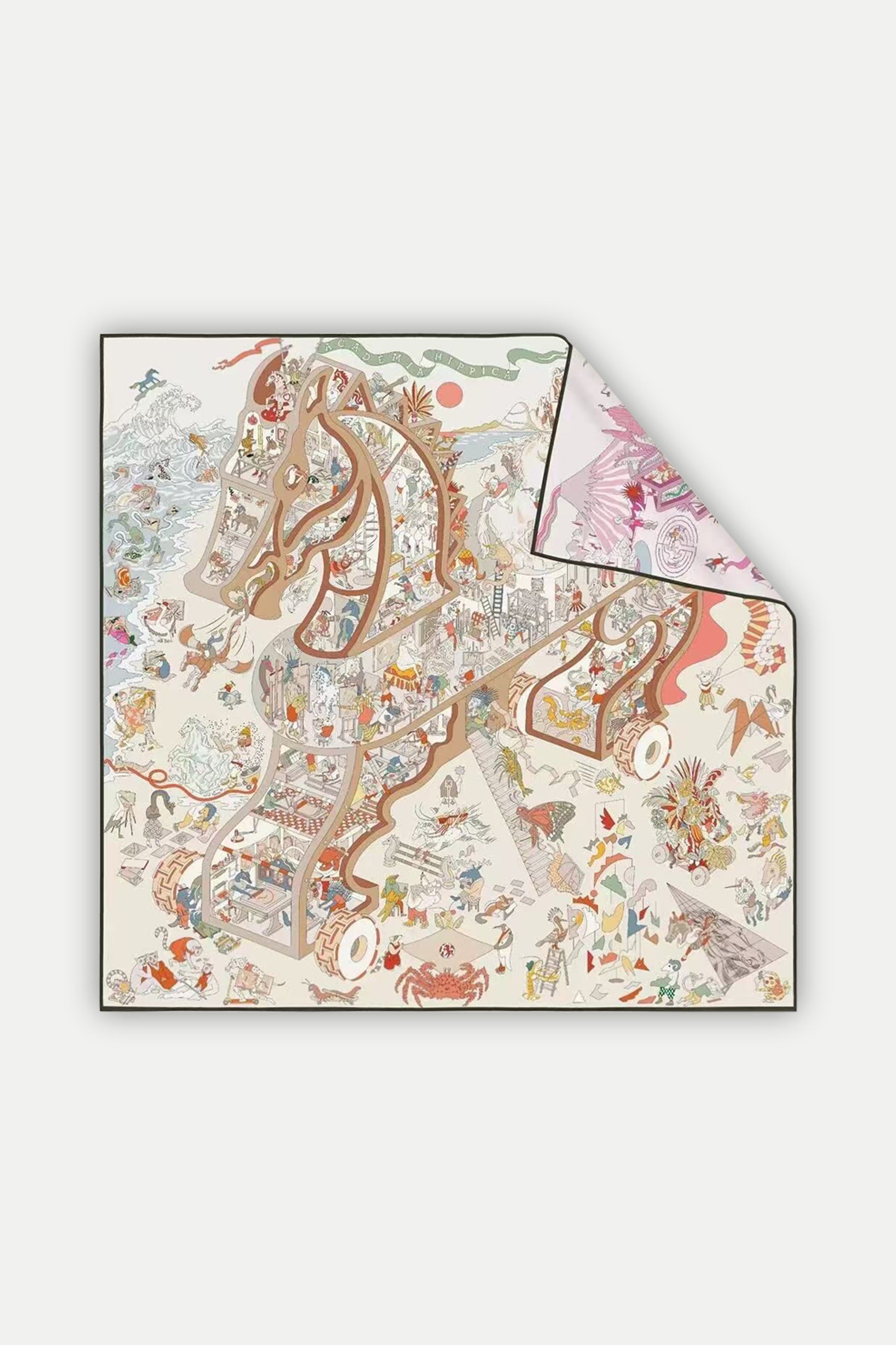 Mit seinen klassischen 90 × 90 cm lässt sich „L’Odyssée Équestre“ vielseitig tragen:
