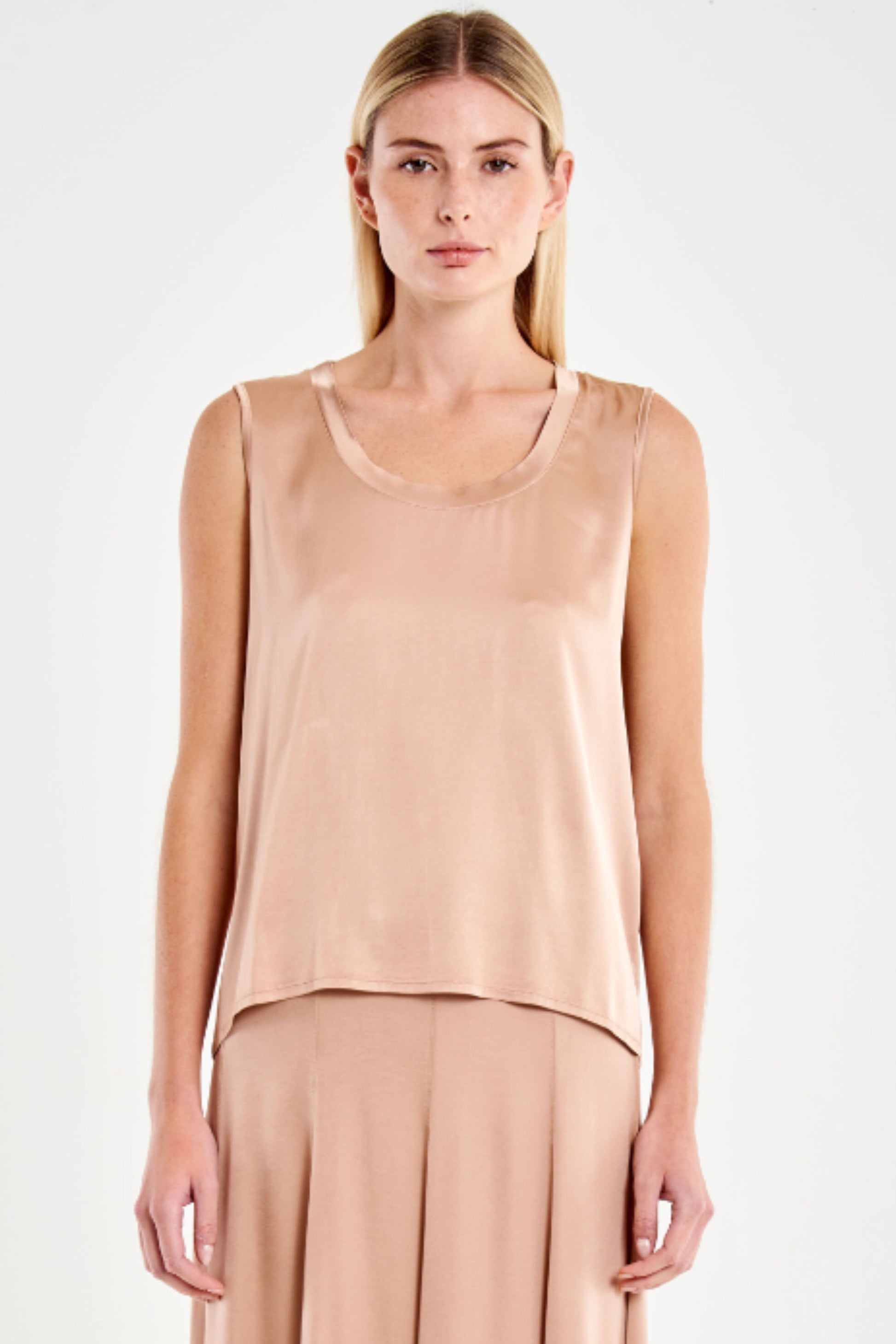 Dieses ärmellose Top überzeugt durch seine klare, feminine Linienführung und eine weich fließende Silhouette. Der lockere, gerade Schnitt sorgt für hohen Tragekomfort und einen eleganten Fall. Der sanft gerundete Ausschnitt ist dezent eingefasst und unterstreicht das minimalistische Design.