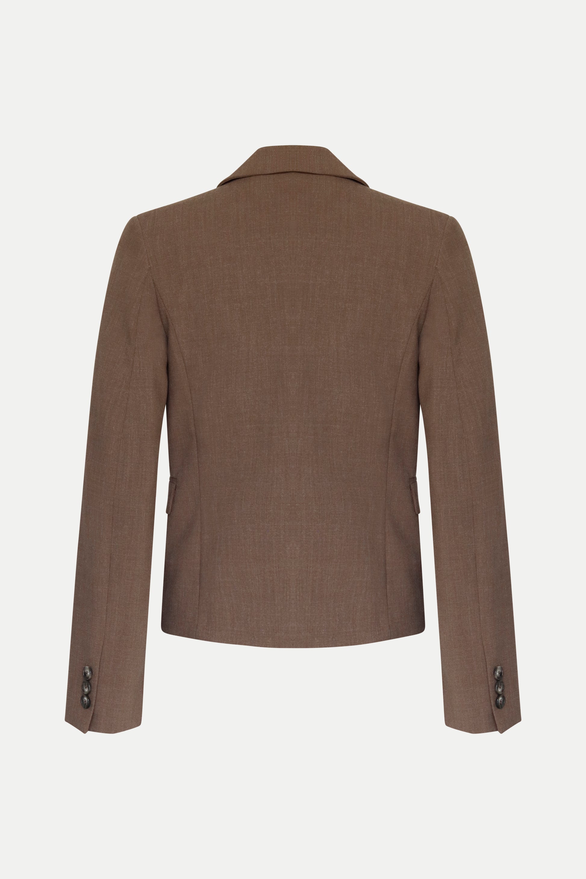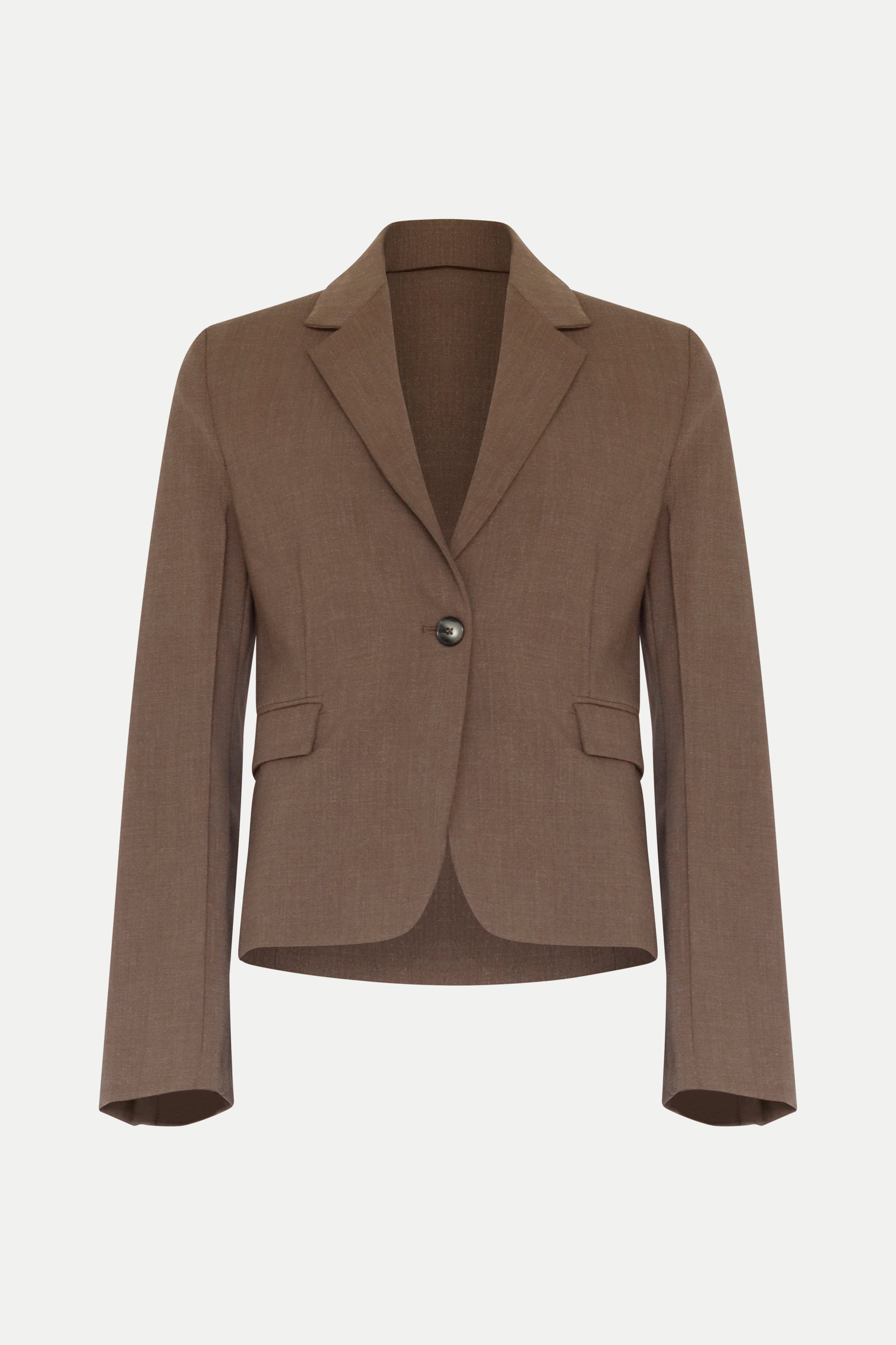 Eleganter Blazer in Braun mit schmaler Passform, der klassische Linienführung mit modernem Chic verbindet. Der Ein-Knopf-Verschluss und die dezenten Pattentaschen unterstreichen den cleanen Look, während das leicht elastische Material für optimalen Sitz und angenehmen Tragekomfort sorgt. Ein vielseitiger Begleiter – ob im Büro, zu Events oder als stilvolles Everyday-Piece.