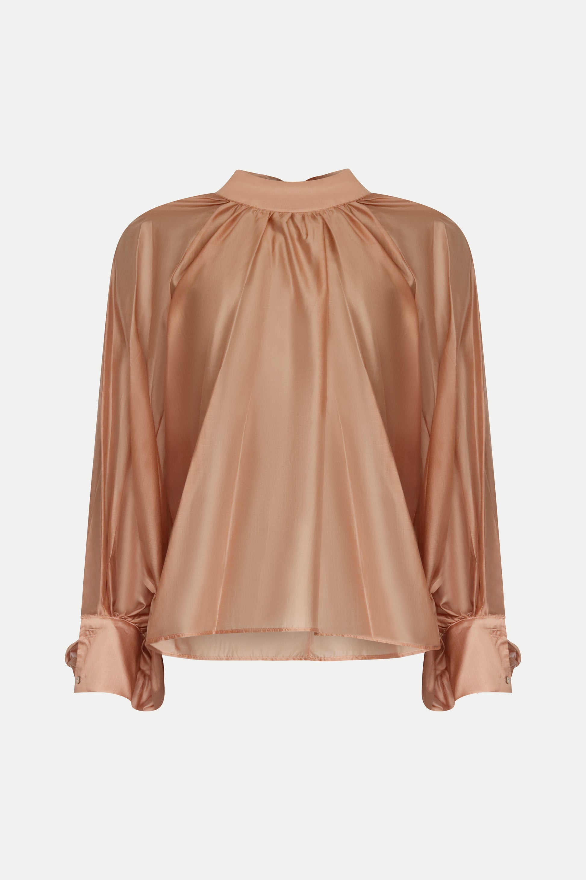 Elegante Bluse in zartem Rosé mit leicht glänzender Oberfläche. Der fließende Schnitt mit weiten Ärmeln und feinen Raffungen sorgt für eine feminine Silhouette, während die Schleife im Nacken ein stilvolles Detail setzt. Ob zur Jeans für einen modernen Alltagslook oder kombiniert mit eleganten Hosen und Röcken – diese Bluse ist ein echter Hingucker.